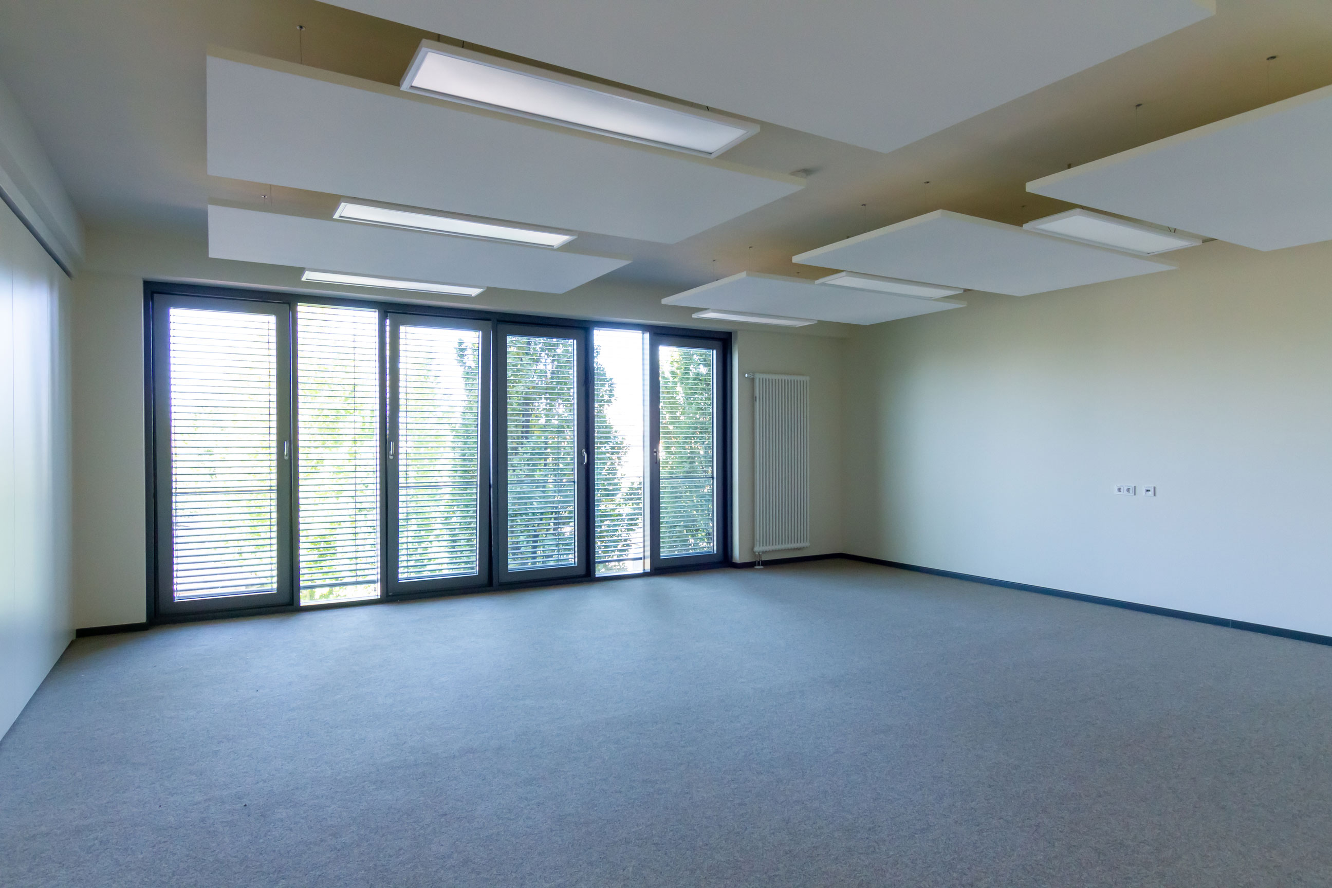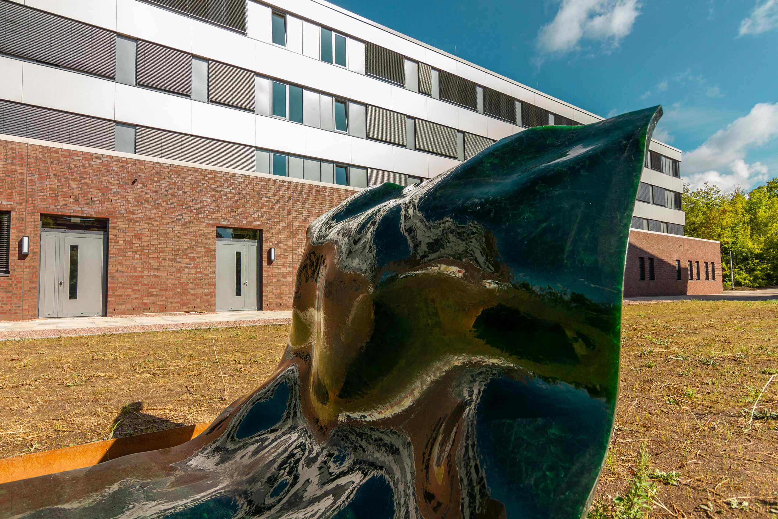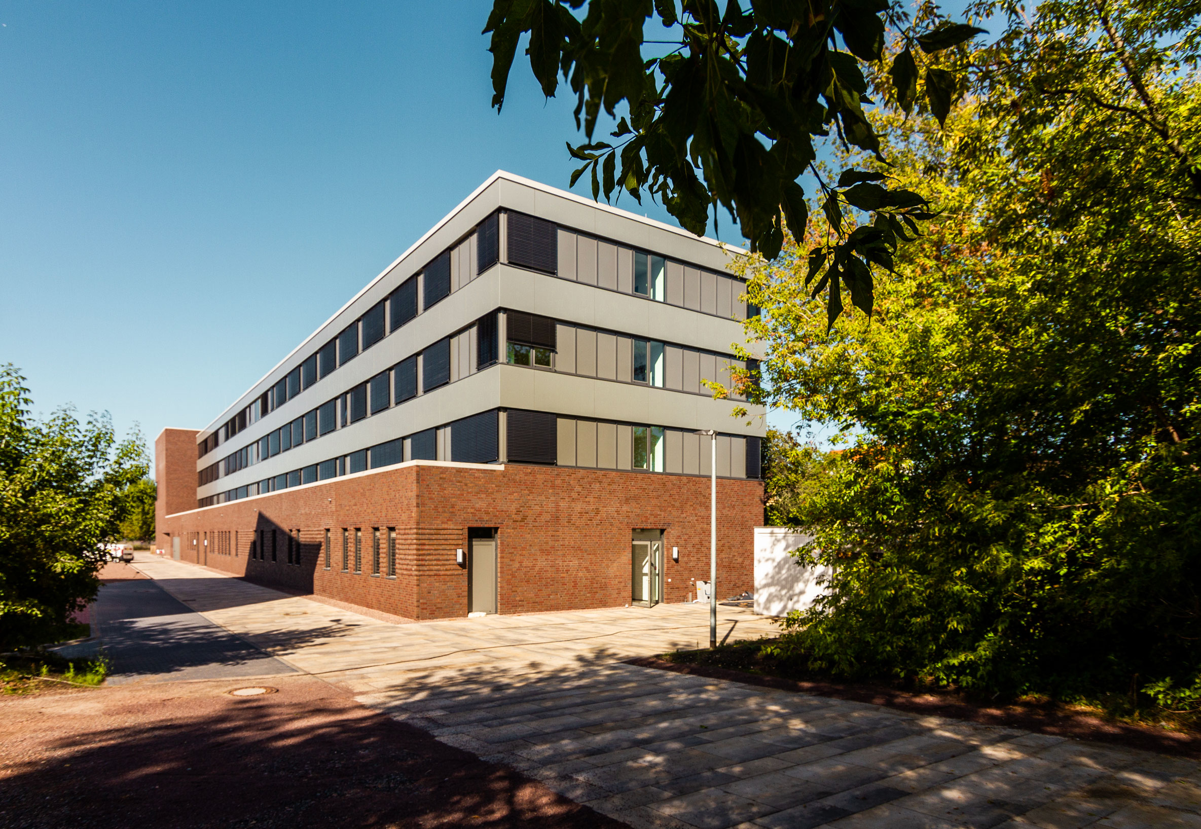 Die Fenster wurden im Bereich der klinkerverkleideten Wandbereiche aus Metallrahmenfenster und -türen montiert, in den restlichen Bereichen als großflächige bzw. bänderartigen Pfosten-Riegel-Konstruktionen. Die Fenster der Südseite erhalten einen außenliegenden Sonnenschutz.