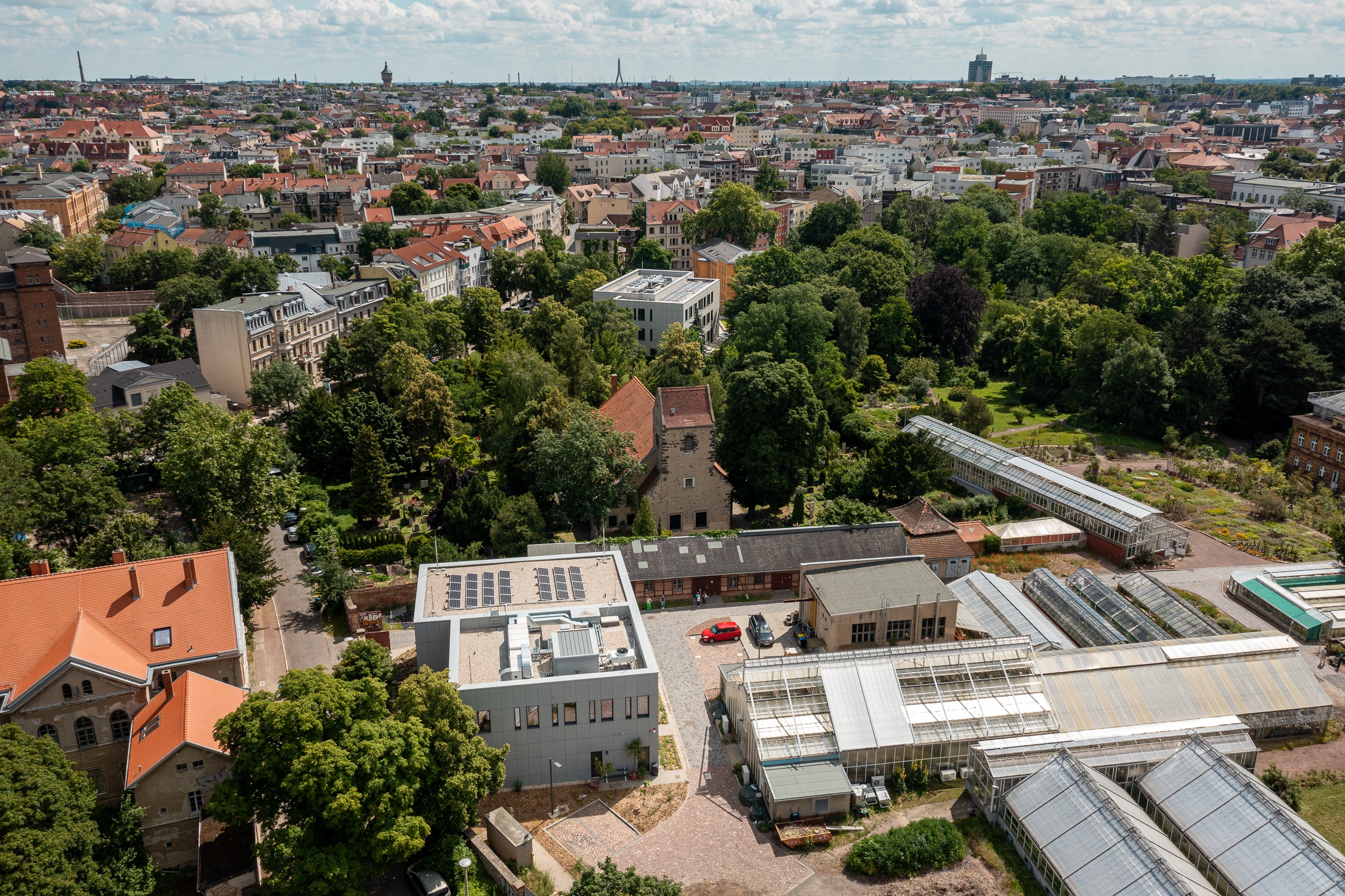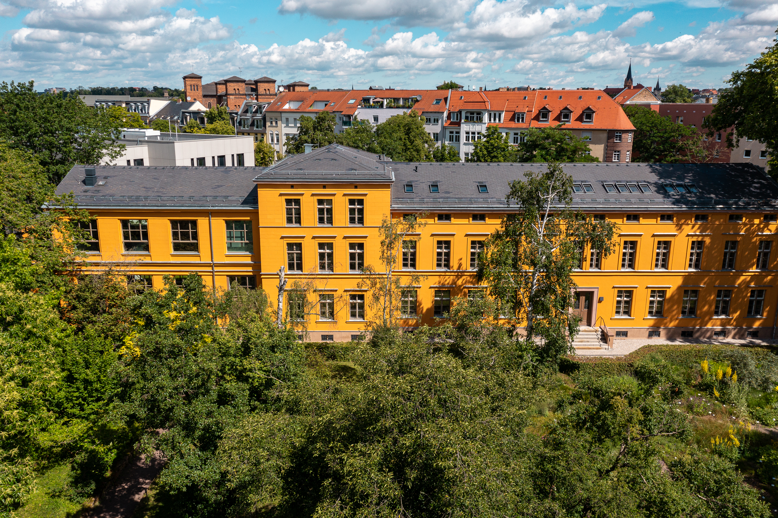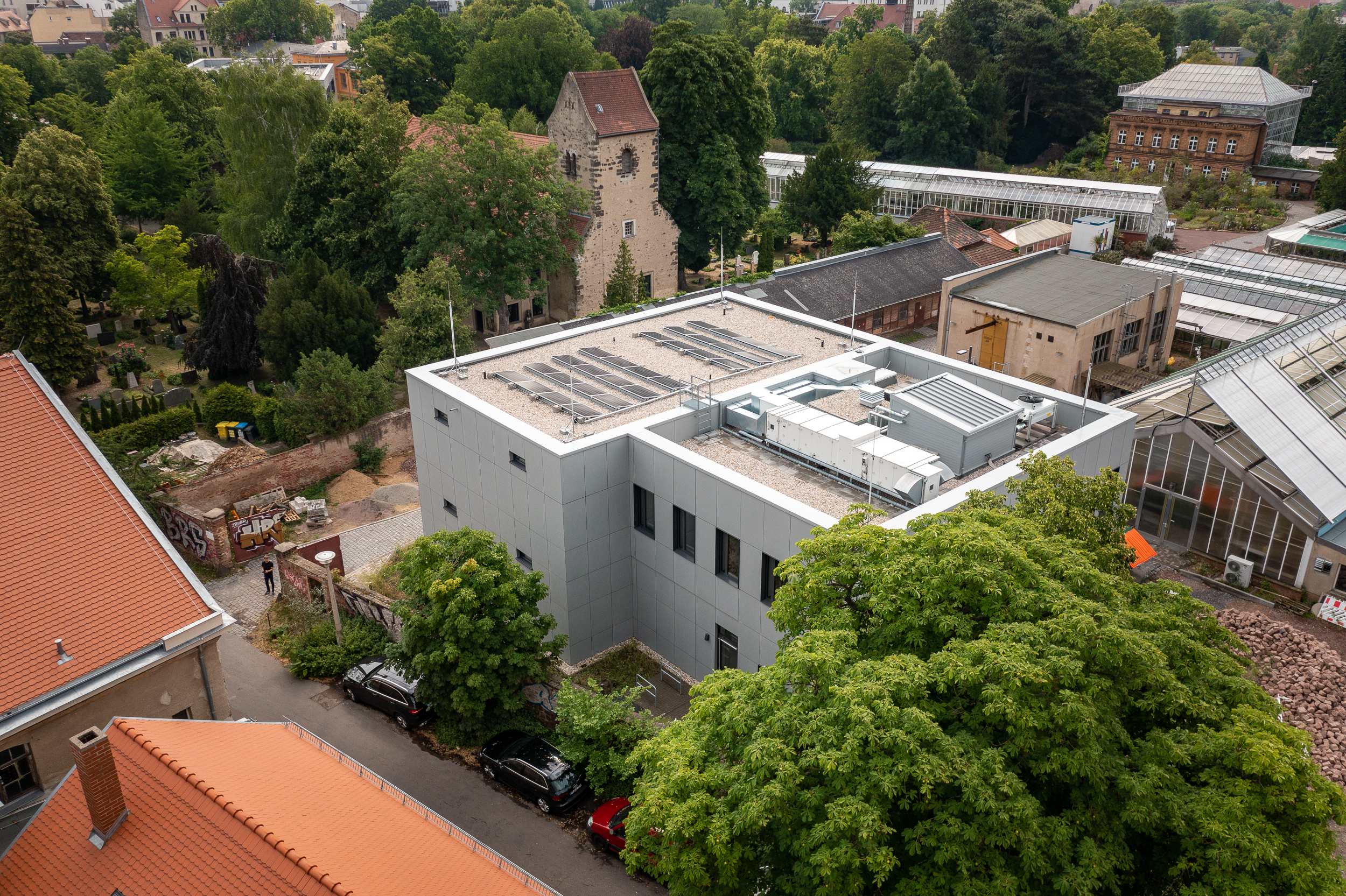 Das aus den 1840er Jahren stammende älteste Institutsgebäude der MartinLuther-Universität befindet sich auf dem Gelände des Botanischen Gartens. In unmittelbarer Nachbarschaft wurde das neue Laborgebäude errichtet. Platz und Höhenbeschränkungen verhindern die Einbindung des Herbariums auf dem ersten Baufeld. Daher wird das Herbarium gesondert auf dem Wirtschaftshof des Botanischen Gartens angeordnet.