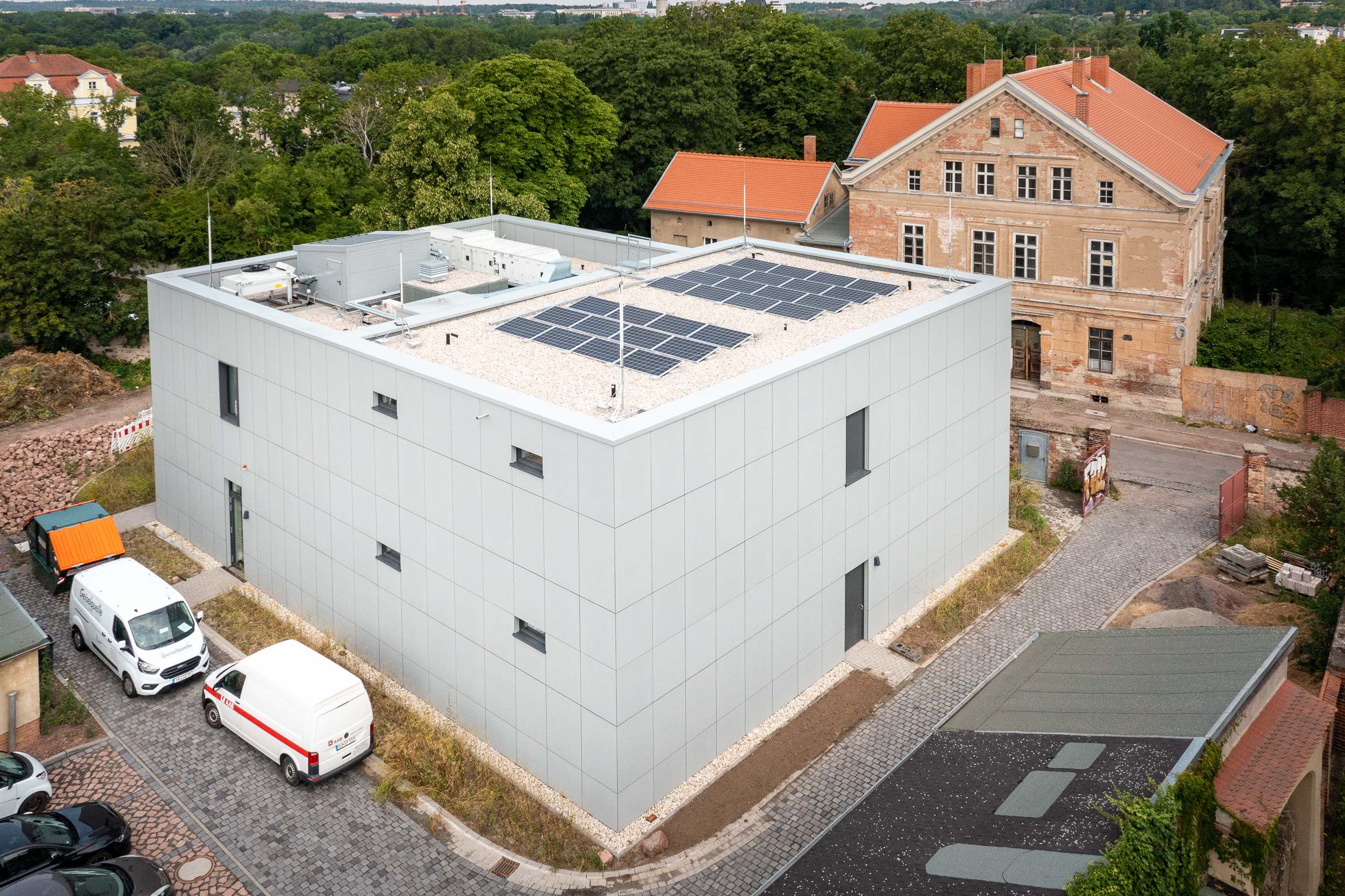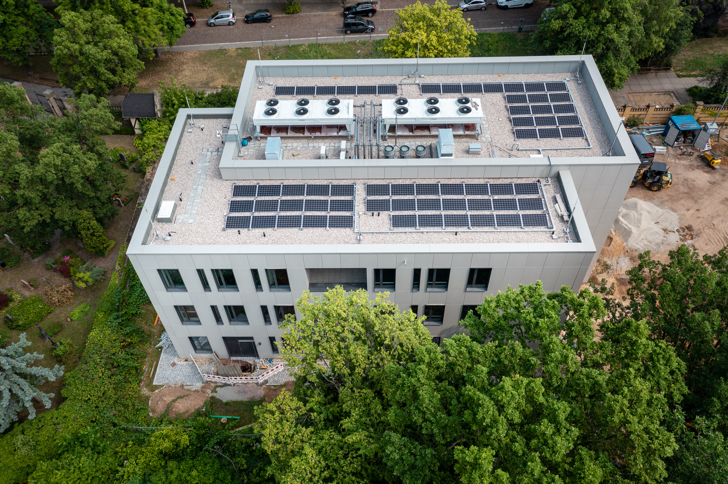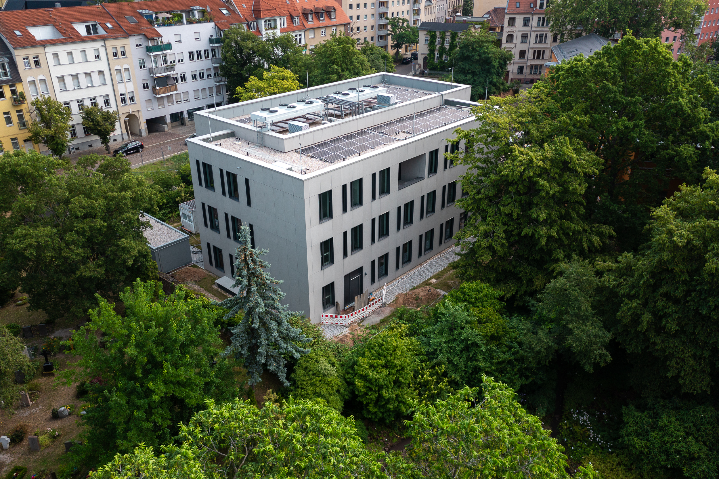 Eine Photovoltaikanlage auf dem Dach, deren Module sehr flach angeordnet sind, konnte trotz denkmalpflegerischer Anforderungen realisiert werden. Eine architektonische Besonderheit des Neubaus stellt die Gestaltung der Fenster dar, die in ihren Proportionen die klassizistischen Vorbilder des Institutsgebäudes aufgreifen.