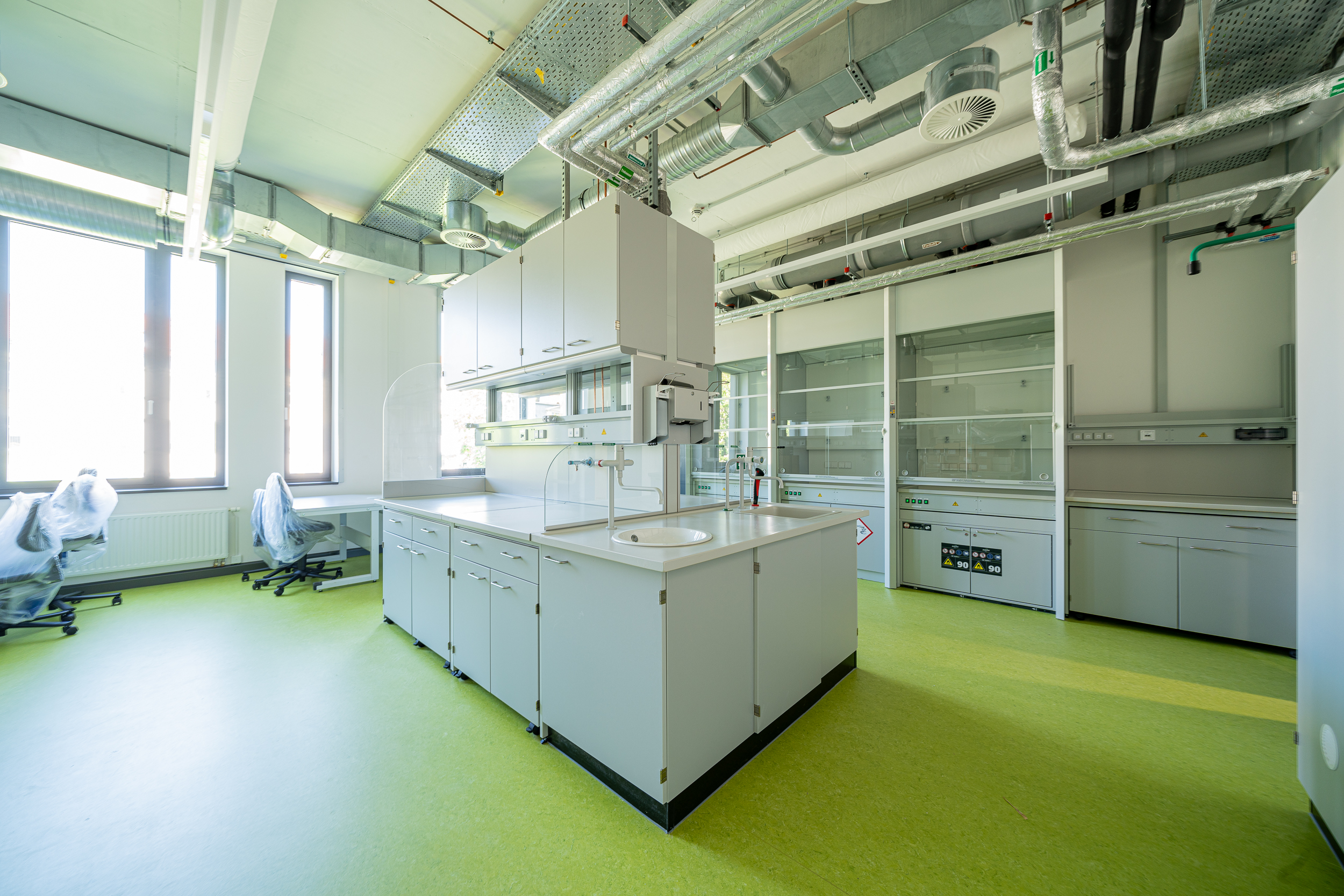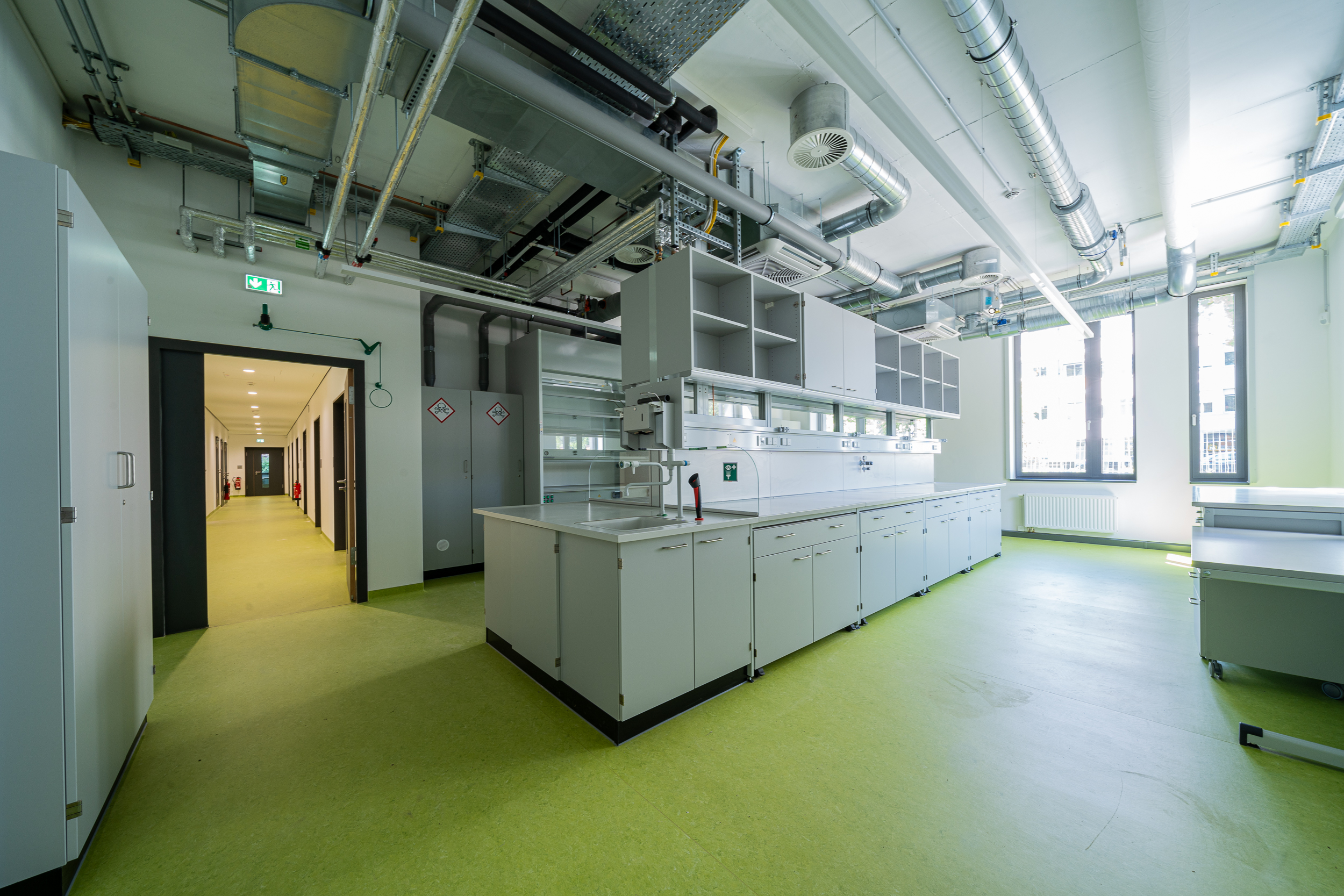 Im Laborneubau, der überwiegend in Stahlbetonbauweise errichtet wurde, sind sämtliche hochinstallierten Bereiche räumlich zusammengefasst. Das Gebäude verfügt über drei oberirdische Geschosse und ein Untergeschoss, in dem größtenteils die Technik einschließlich der Lüftungsanlagen untergebracht wurde.