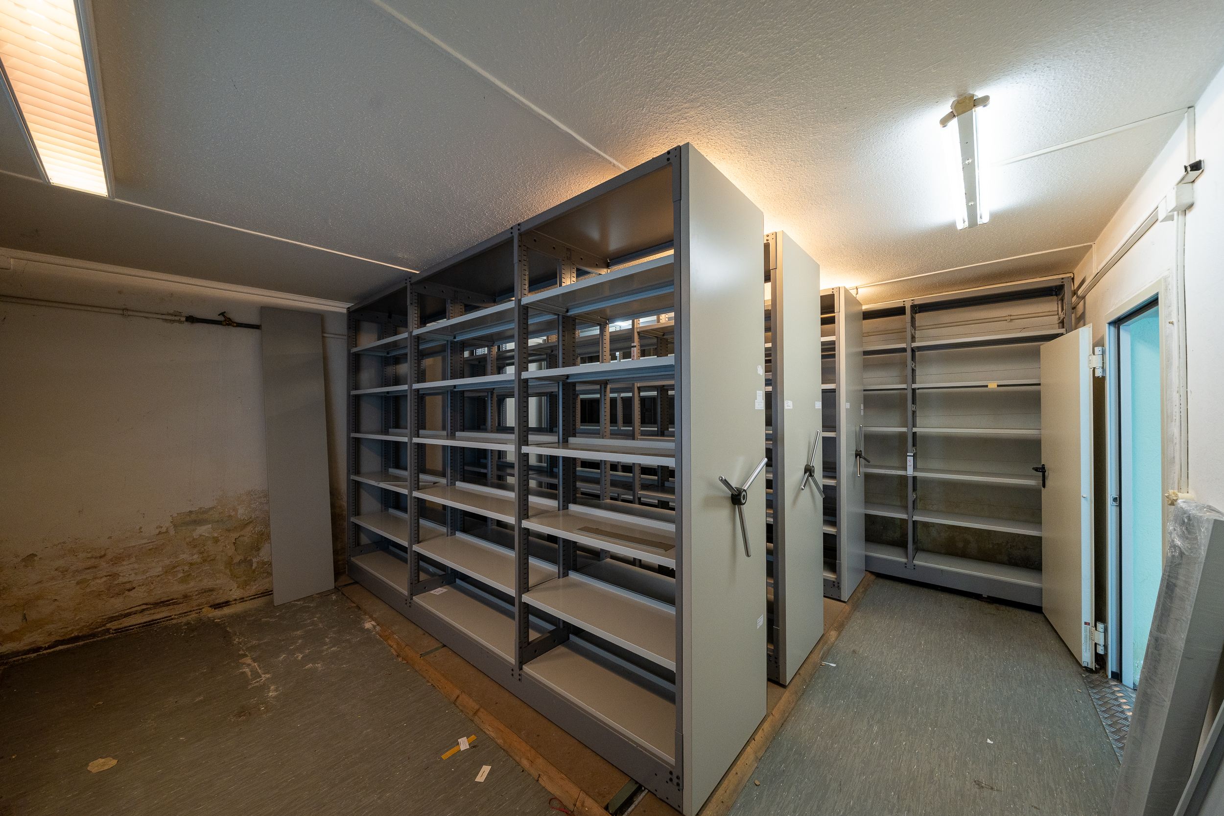 Im Erdgeschoss wurden hauptsächlich 6 Räume für Büro- und zwei für Archivzwecke genutzt. Die Archive sind zum Teil mit Rollregalanlagen ausgestattet, über deren Funktionsfähigkeit keine Gewissheit besteht. Die Regalanlagen sind fest verbaut und verbleiben mit Verkauf in der Immobilie.